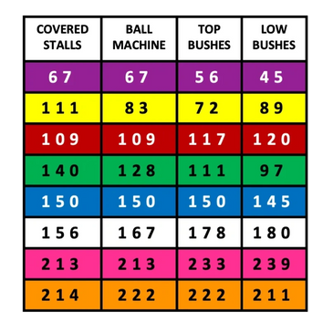 These yardages reflect the flag yardages including the limited flight range balls, thus adding 10% to the distance.